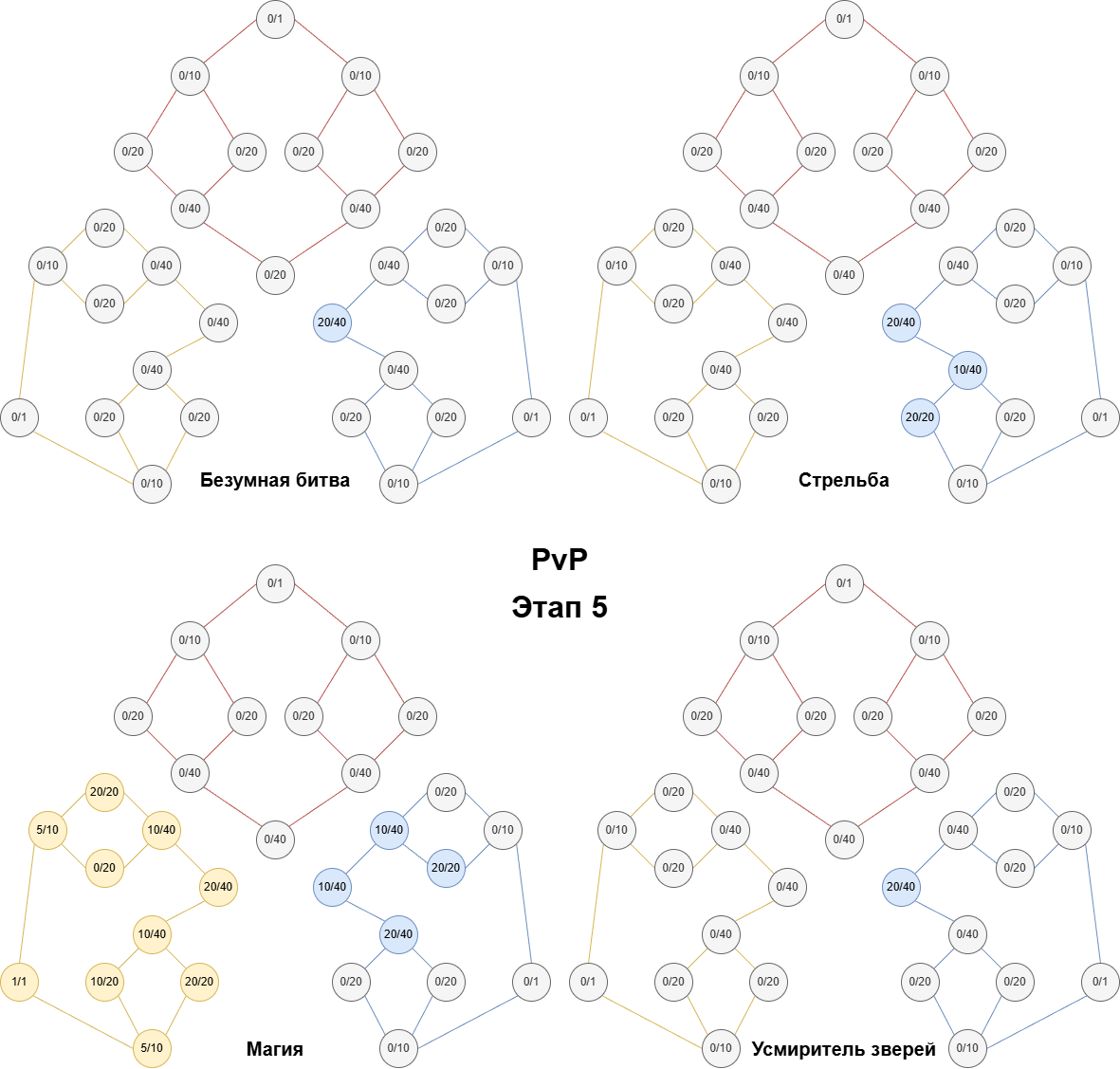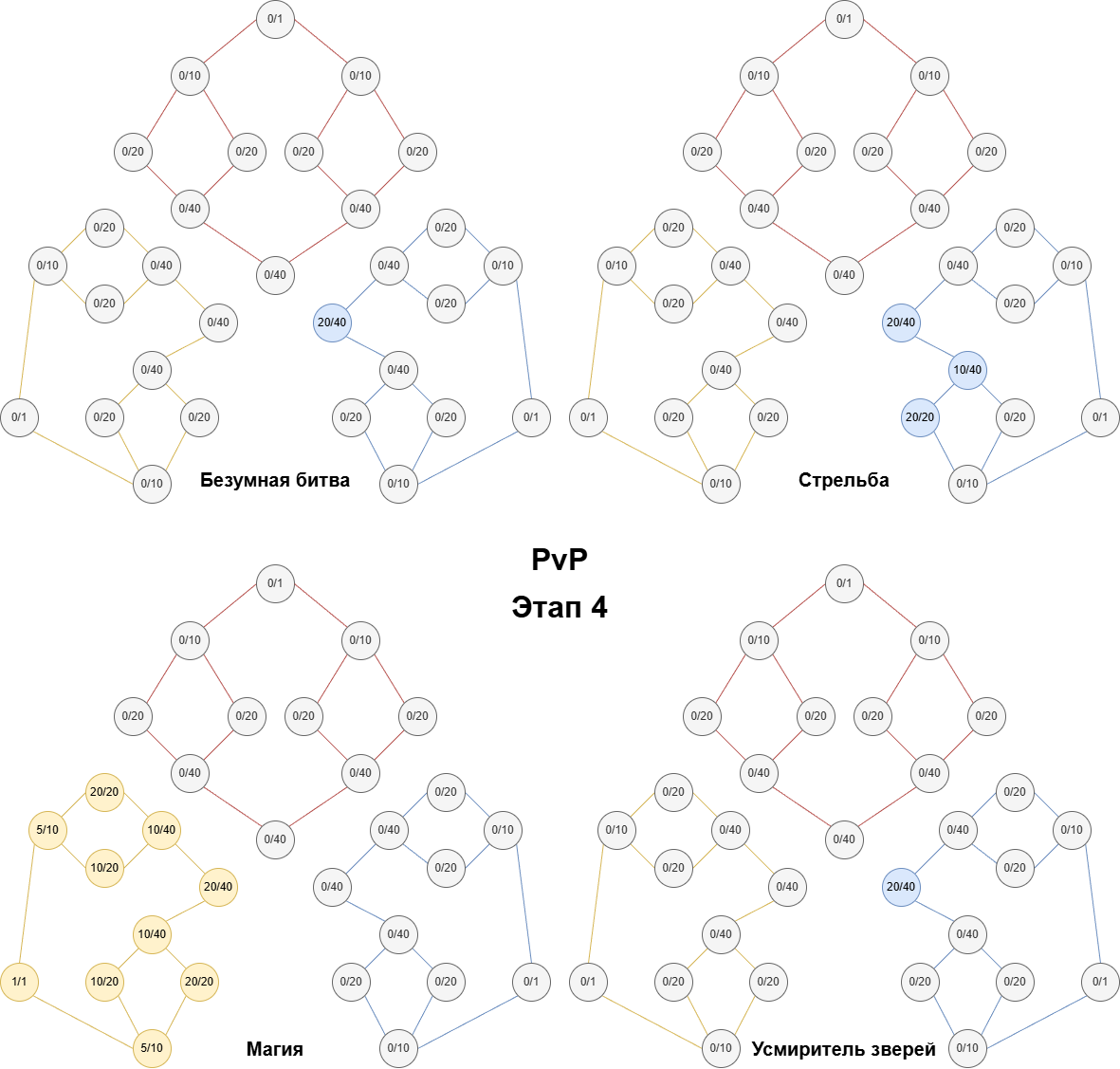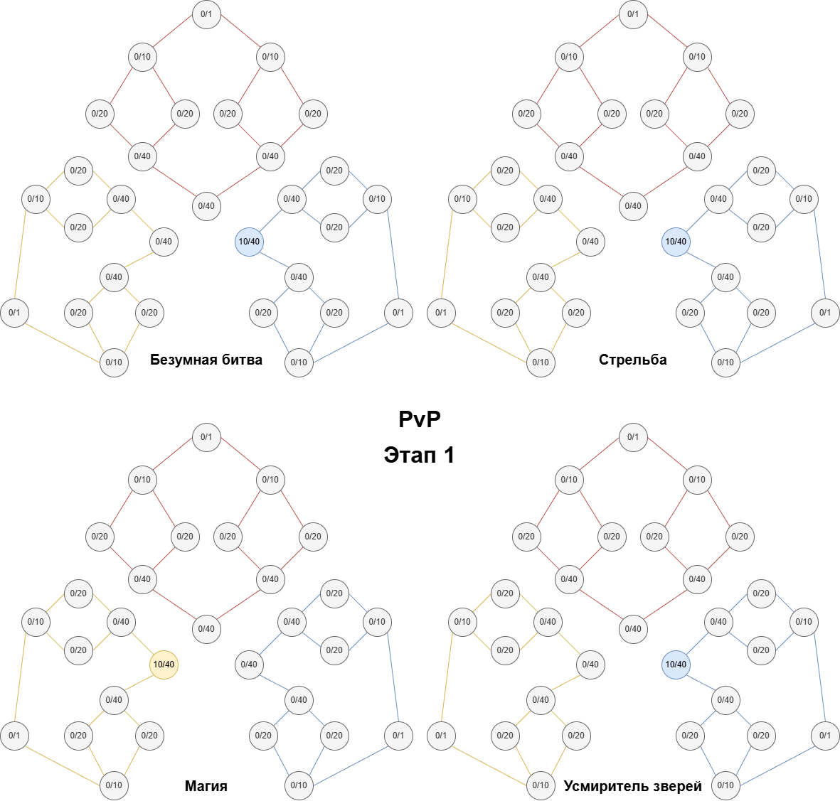 - В каждой ветке (Безумная битва, Стрельба, Магия, Усмиритель зверей): атака 40/40