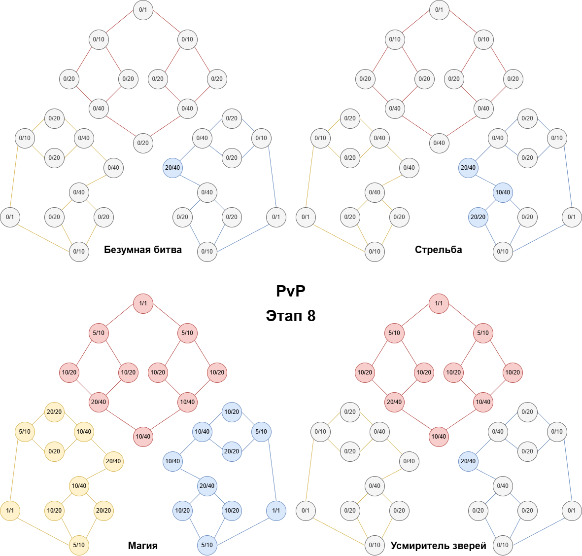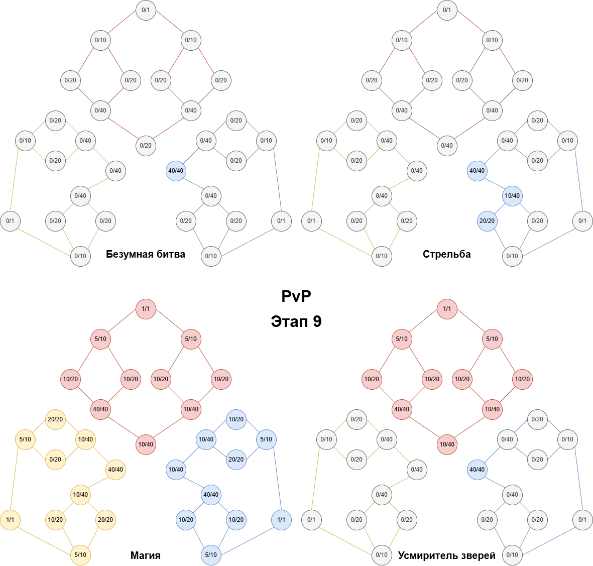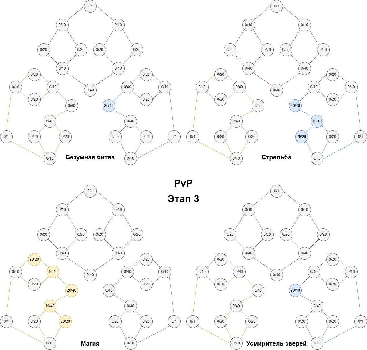 - В каждой ветке (Безумная битва, Стрельба, Магия, Усмиритель зверей): атака 40/40